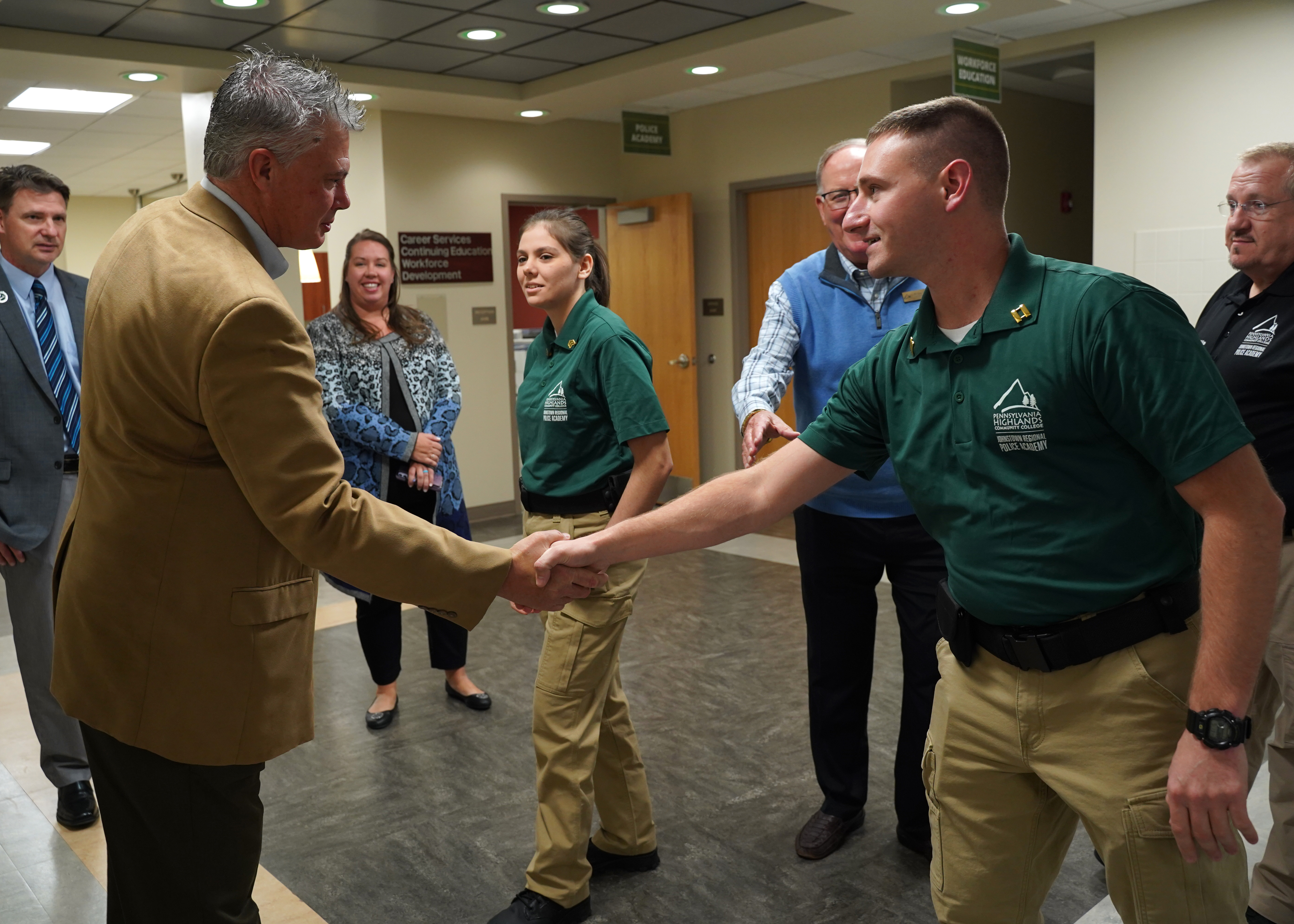 - Jeffrey Wood (left), President of the Pennsylvania Highlands Community College Foundation Board of Directors, shaking hands with Cadet Angel Raehl (right) outside of the Police Academy classrooms at the College’s Richland Campus.